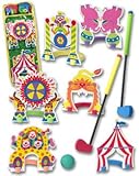 An indoor/outdoor mini golf set with a fun circus theme. The clubs measures 24" and made of foam and plastic. The standees measure 8" tall and made of foam.